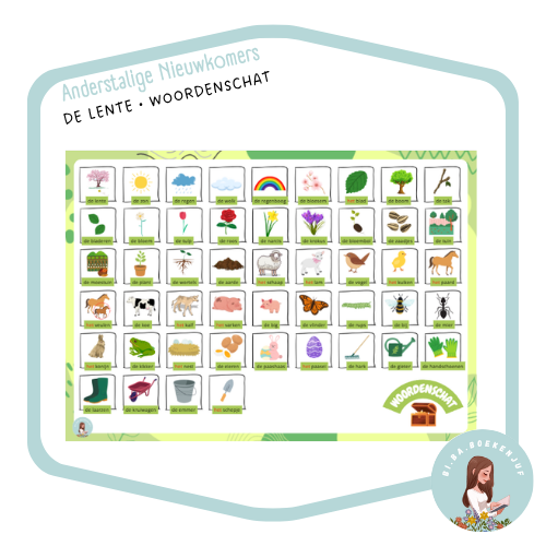 Woordenschat die aan bod komt: de lente, de zon, de regen, de wolk, de regenboog, de bloesem, het blad, de boom, de tak, de bladeren, de bloem, de tulp, de roos, de narcis, de krokus, de bloembol, de zaadjes, de tuin, de moestuin, de plant, de wortels, de aarde, het schaap, het lam, de vogel, het kuiken, het paard, het veulen, de koe, het kalf, het varken, het big, de vlinder, de rups, de bij, de mier, het konijn, de kikker, het nest, de eieren, de paashaas, het paasei, de hark, de gieter, de handschoenen, de laarzen, de kruiwagen, de emmer, het schepje, planten, zaaien, plukken, maaien, sproeien, snoeien, groeien.